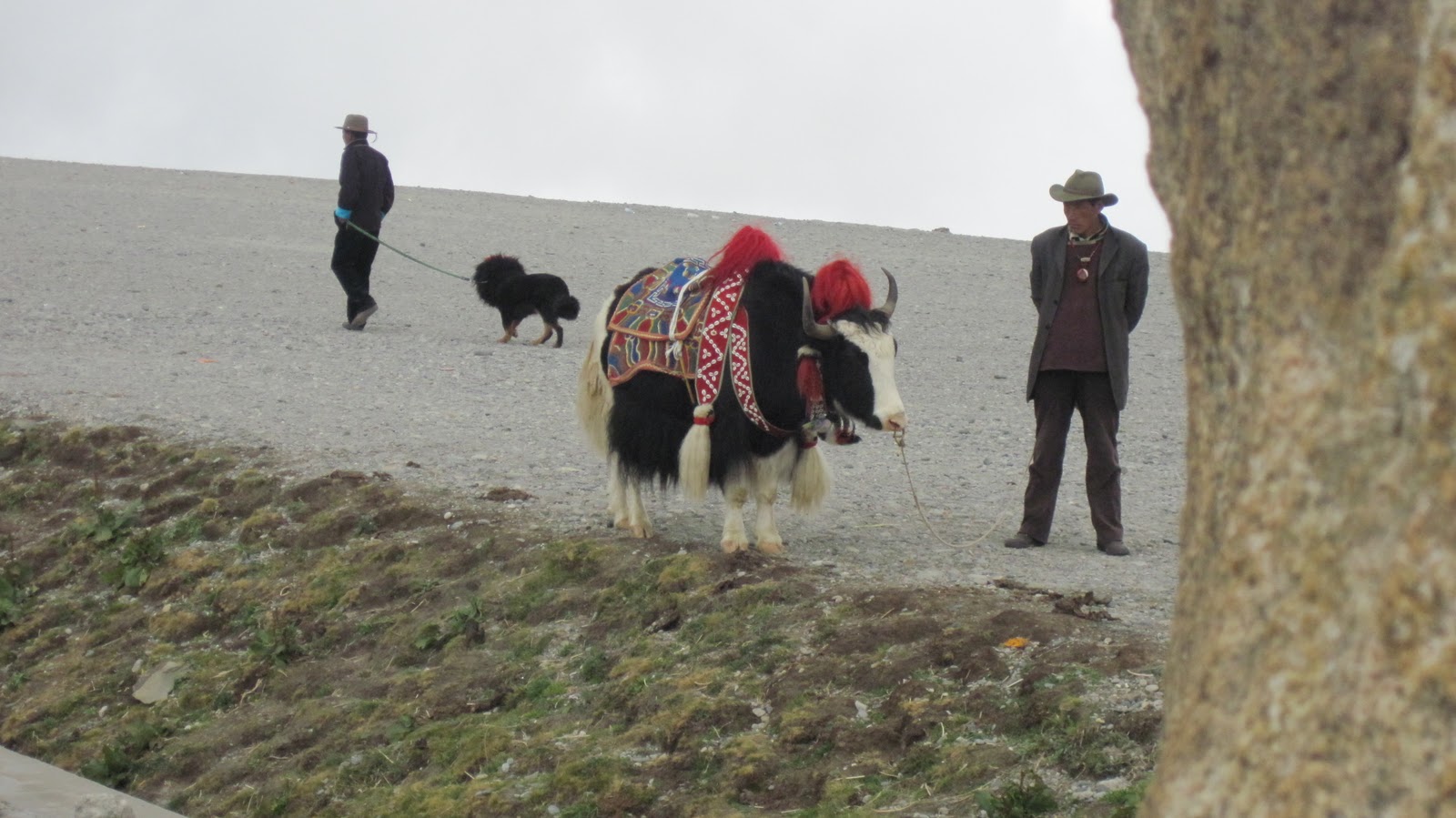 The next day we took a long 2.5 hour bus ride up a switchback, hairpin road through Khampa pass to view Yamdrok Yumtso, a beautiful, turquoise, lake ~15,700 feet high up in the Himalayan mountains; this would be my first real test at altitude. Pema, having been raised at this height suffered no ill effects at all. Six of the nine people in our group, including myself, were taking drugs to help us cope. The air is thin up there and I felt a little light headed and out of breath if I moved too quickly, but those not taking the drug felt the effects much more intensely; the same result would be seen on Mt. Kilimanjaro. It was a little overcast so the lake didn’t have the brilliant turquoise hue it would have on a bright sunny day, but you would occasionally get a glimpse of its’ splendor when the sun shone through the broken clouds. Up here you could get your picture taken dressed in a fine Tibetan outfit while sitting on a yak, but I chose to pass on this corny costumery, sorry guys. We stayed only long enough to take some photos and use the toilet (an unforgettable smell sensation) before heading partway down the mountain, stopping to have a picnic lunch at a roadside overlook covered with prayer flags. From there our journey continued on down to Lhasa at an elevation ~12,000 feet.